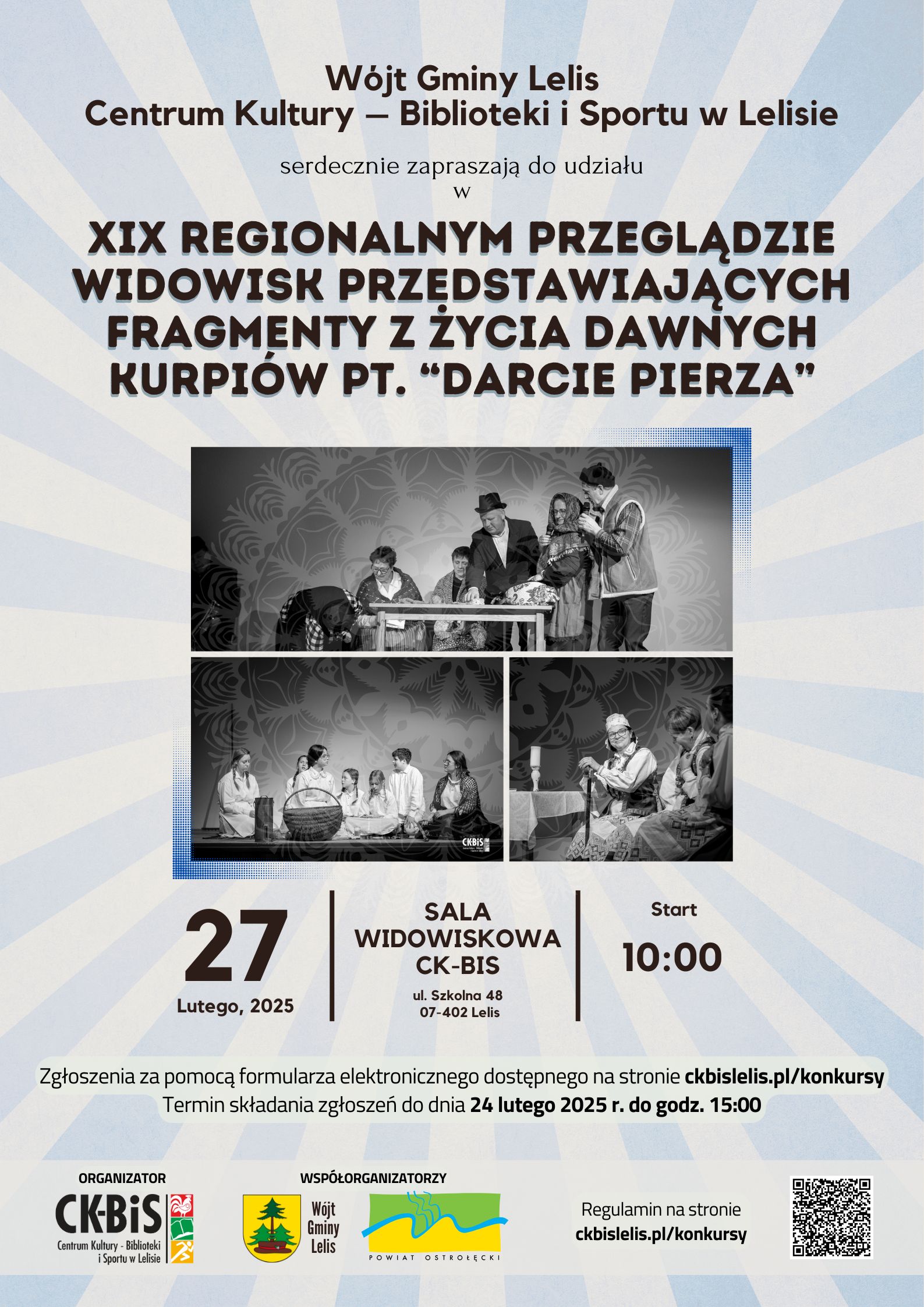 Zapraszamy wszystkich miłośników kultury i tradycji Kurpiów na wyjątkowe wydarzenie. Już 27 lutego o godzinie 10:00 w Centrum Kultury - Biblioteki i Sportu w Lelisie odbędzie się XIX Regionalny Przegląd Widowisk pt. "Darcie Pierza".